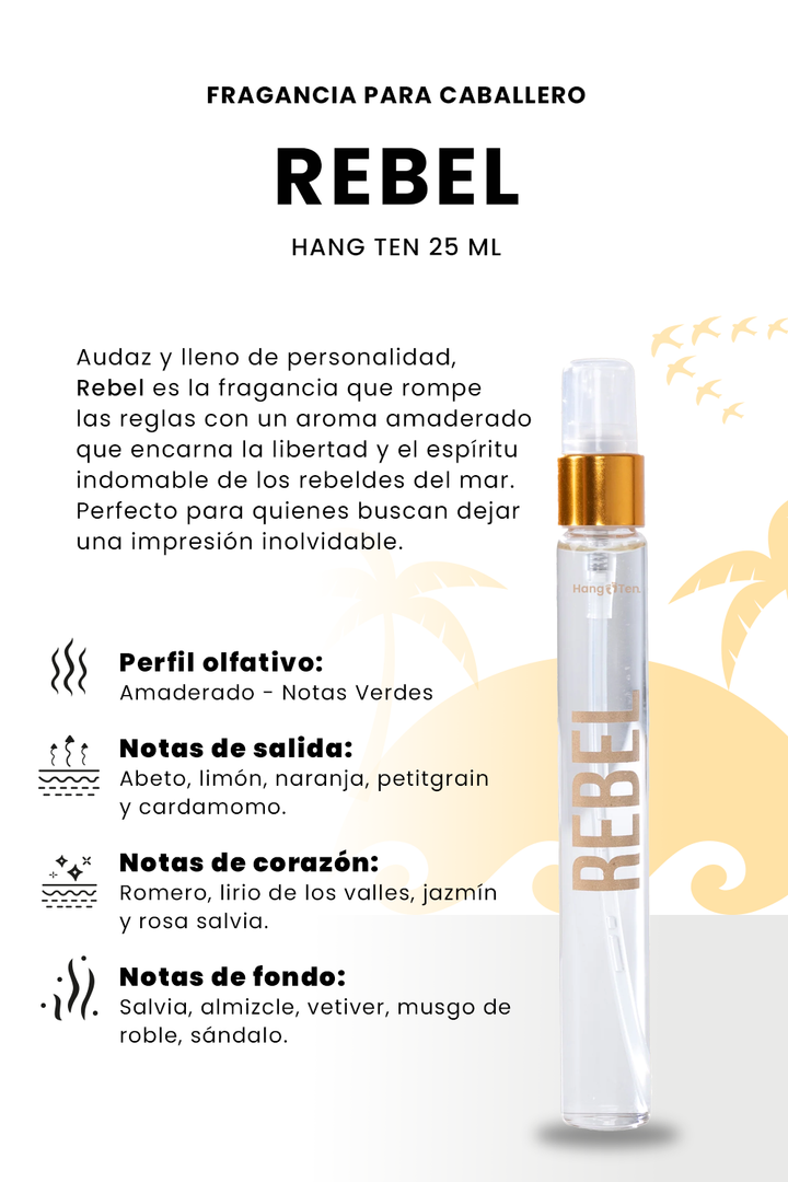 Perfume Rebel 25ml para hombre ofrece un perfil olfativo amaderado con notas verdes frescas que despiertan los sentidos. Su composición equilibrada combina la intensidad del abeto, la frescura vibrante del limón y la elegancia aromática del romero, complementadas con la calidez del almizcle y la profundidad del sándalo. Ideal para quienes buscan una fragancia distintiva que refleje confianza y personalidad.