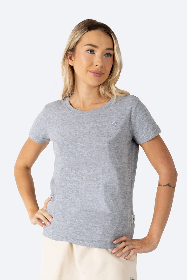 Esta playera básica gris claro para mujer está confeccionada con una mezcla de 60% algodón y 40% poliéster, que garantiza suavidad y resistencia. Su diseño de cuello redondo y manga corta ofrece un estilo clásico y cómodo, ideal para cualquier ocasión casual. Una prenda esencial que combina funcionalidad y versatilidad en el guardarropa femenino.